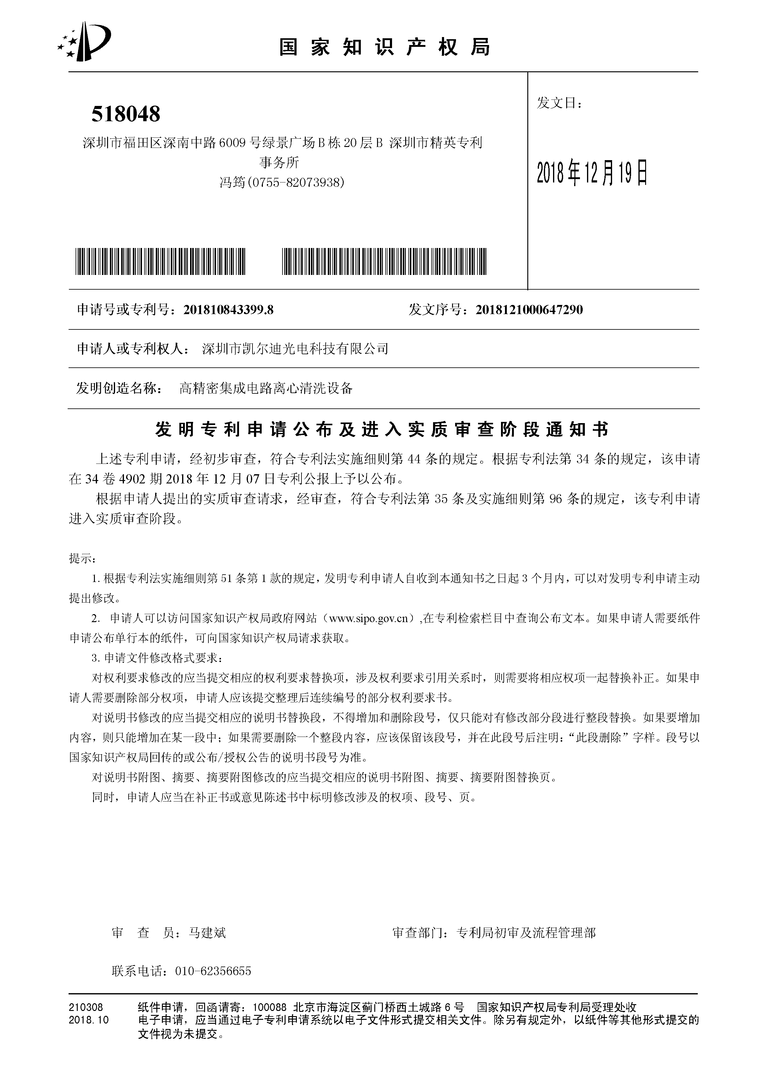 实质审查通知书高精密集成电路离心清洗设备