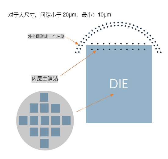 我们的专利喷嘴专为清洗大尺寸封装和极小间隙设计,能够应对间隙小于20μm,甚至最小可达10μm的精密清洗要求。